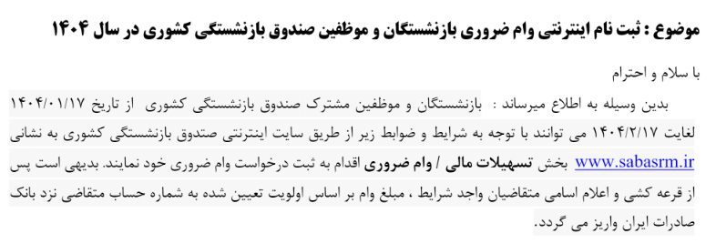 ثبت نام اینترنتی وام ضروری بازنشستگان و موظفین صندوق بازنشستگی کشوری ۲۰ فروردین ۱۴۰۴ | ۱۱:۵۹ کد : ۵۰۶۴۱ اطلاعیه ارسال به دیگران نام شما ایمیل شما ایمیل دریافتکننده ارسال انصراف تعداد بازدید:۴۴۱۲ ثبت نام اینترنتی وام ضروری بازنشستگان و موظفین صندوق بازنشستگی کشوری