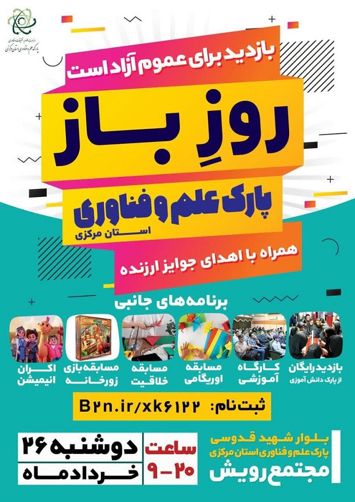 به اطلاع می رساند پارک علم و فناوری استان مرکزی در راستای ایفای رسالت ترویجی خود و به منظور ارتقای آگاهی عمومی نسبت به ظرفیت ها، توانمندی ها و زیرساخت های پارک علم و فناوری استان، اقدام به برگزاری رویدادی تحت عنوان " روز باز پارک علم و فناوری " نموده است.