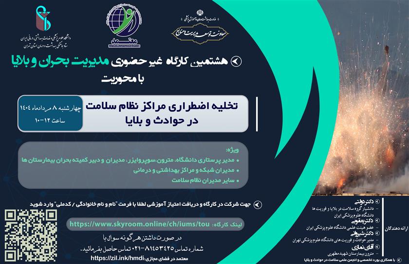 موسسه عالی تربیت و توسعه مدیران نظام سلامت وزارت بهداشت در نظر دارد با همکاری ستاد هماهنگی بهداشت و درمان استان تهران، پیرو سلسله کارگاه های غیرحضوری مدیریت بحران و بلایا، کارگاه غیر حضوری با محوریت "تخلیه اضطراری مراکز نظام سلامت در حوادث و بلایا" را به شرح ذیل برگزار نماید.
