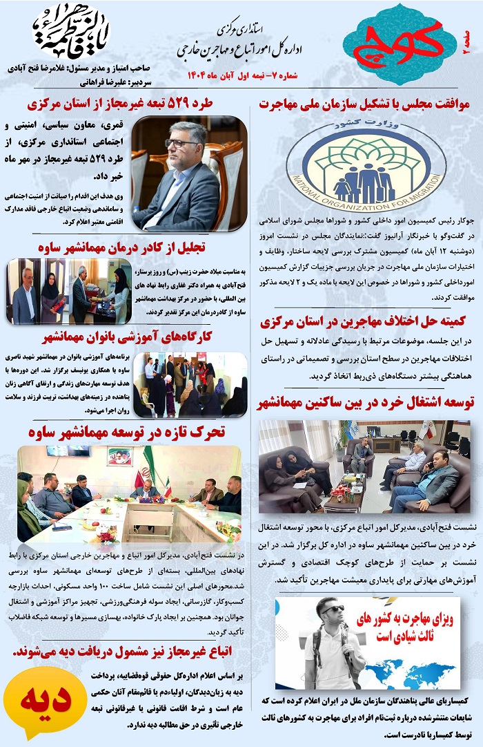 هفتمین شماره نشریه کوچ، توسط دفتر امور اتباع و مهاجرین خارجی استان مرکزی منتشر گردید.